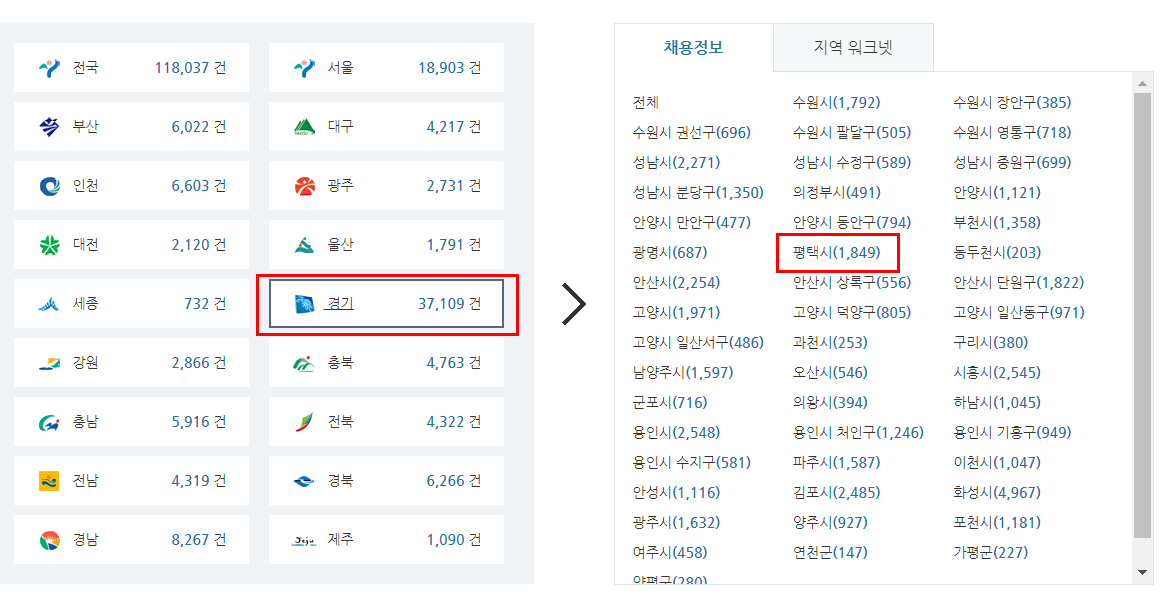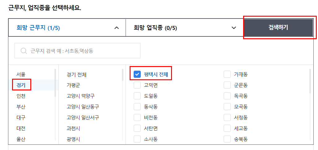 채용정보 - 지역별 - 경기 - 평택시 를 선택합니다.