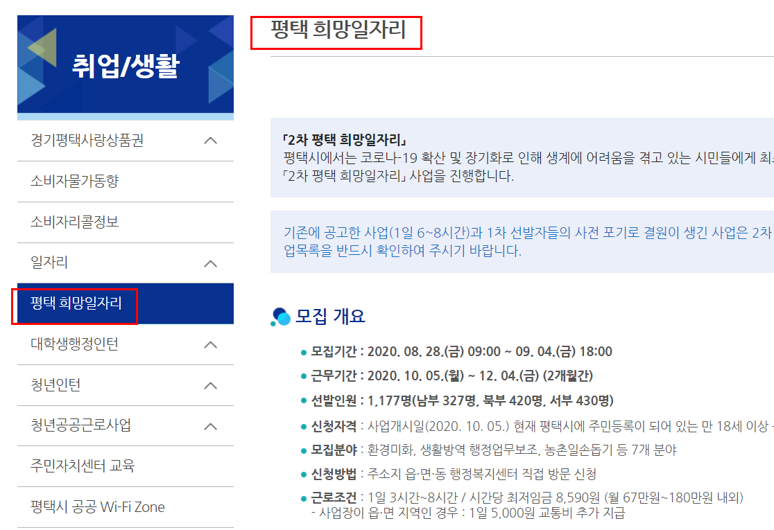 왼쪽 '평택희망일자리' 메뉴에서 찾을 수 있는데요.