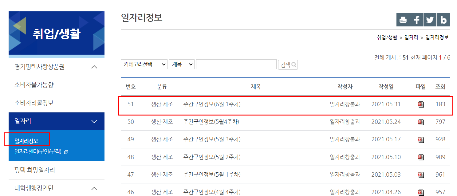 일자리정보 목록 | 일자리 | 취업/생활 | 평택시