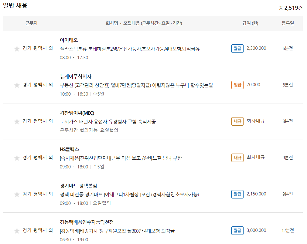 평택시내 택배 경비,청소원, 방재원, 건설 배관공, 객실청소, 시장내 식당, 룸메이드, 화물운전기사, 생활지원사, 주방보조, 산후조리 종사원,요양보호사 등등 다양한 구인구직 정보를 얻을 수 있습니다.