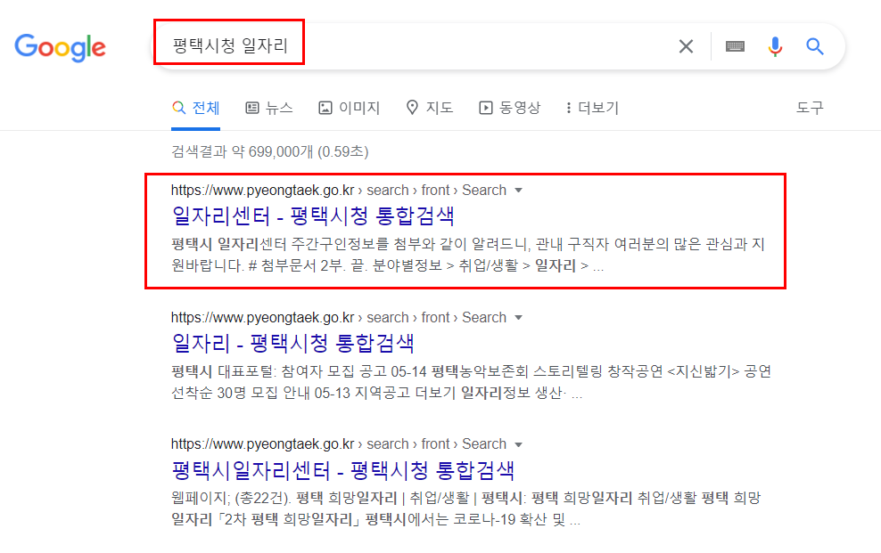 구글에서 "평택시청 일자리"라고 검색하면 찾을 수 있습니다.