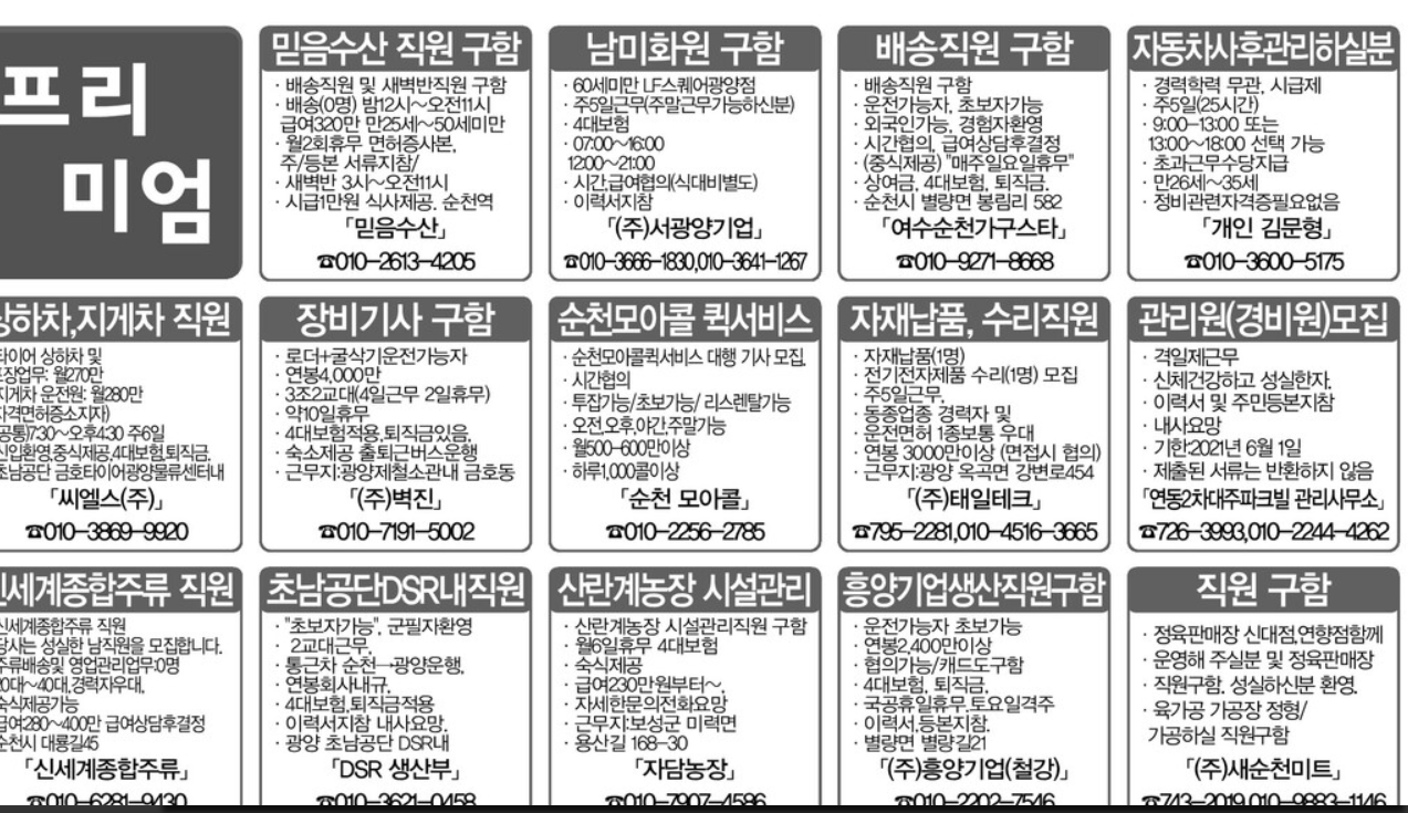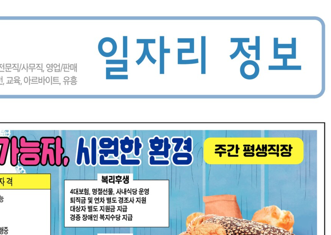 환경미화원, 경비원, 건어물가게 홀서빙원, 운전직 취업, 건설토목현장 일용직, 요양보호사, 요식업 단기 알바, 건물 청소원, 보안회사 경비원, 어린이집 보육교사, 시설관리원, 석면조사기관 인력을 구하고 있습니다.