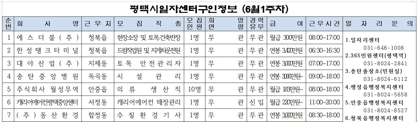 첨부 파일을 열면 아래와 같이 평택시 일자리 센터 구인정보를 확인할 수 있습니다.